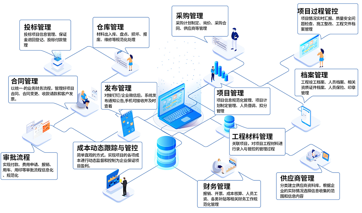 數(shù)字化管理系統(tǒng)對(duì)企業(yè)工程項(xiàng)目從項(xiàng)目投標(biāo)中標(biāo)、項(xiàng)目過程管理、合同管理、物資設(shè)備管理、采購管理、項(xiàng)目過程管理、施工隊(duì)管理、供應(yīng)商、成本核算等進(jìn)行全面綜合管理;縱向貫穿投標(biāo)、采購、施工、竣工的全過程,橫向涉及公司內(nèi)部的各相關(guān)崗位,是一套全方位、集成的企業(yè)項(xiàng)目綜合管理平臺(tái)。通過對(duì)成本、進(jìn)度、質(zhì)量、安全等方面的控制,以及對(duì)合同、結(jié)算、支付、資金等要素的管理,來提高工程類企業(yè)對(duì)工程項(xiàng)目的綜合配套能力。